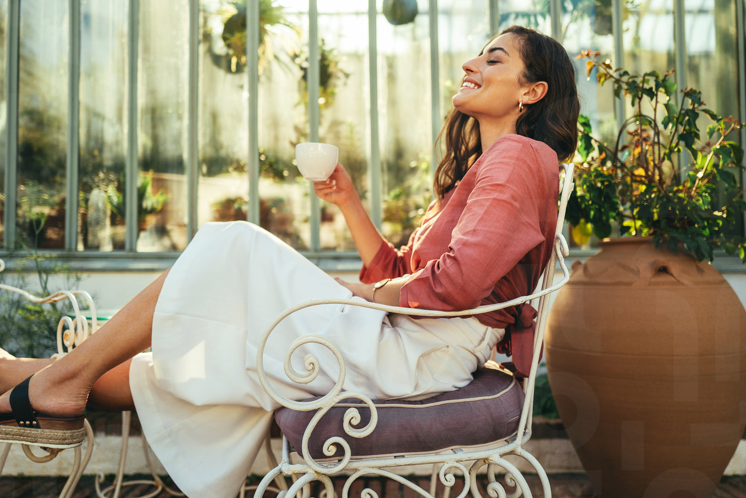 Carefree young tourist woman smiling cheerfully while sitting alone outside a luxury hotel. Happy young woman holding a cup of coffee while relaxing outdoors. Woman enjoying her summer getaway.