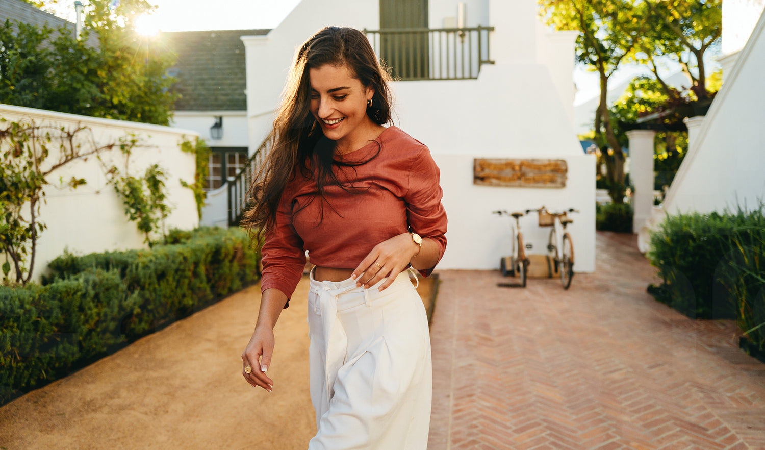 Happy young tourist woman walking alone outdoors. Young woman smiling cheerfully while vacationing at a holiday resort. Woman enjoying her weekend getaway during the summer.