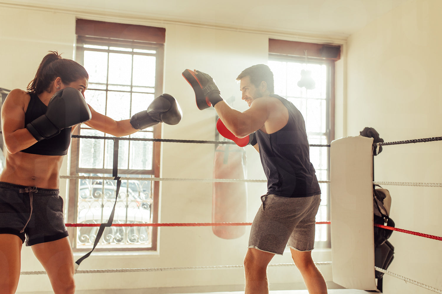Muscular female boxer striking focus mitts held by her personal trainer in a boxing ring. Sporty young woman having a training session with her coach at the gym.