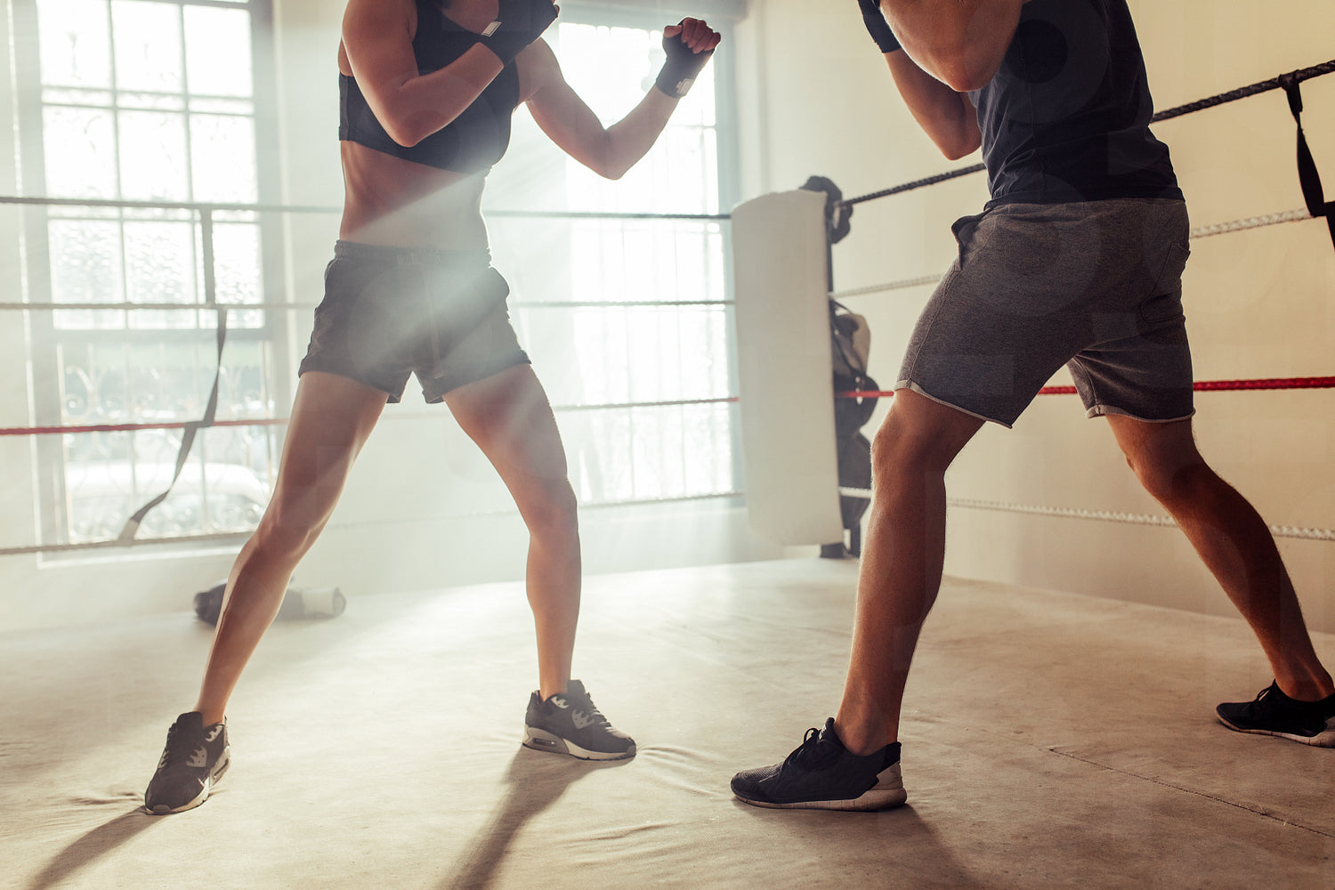 Low angle view of two young boxers fighting in a boxing ring. Two young athletes facing each other during a training session in a boxing gym.