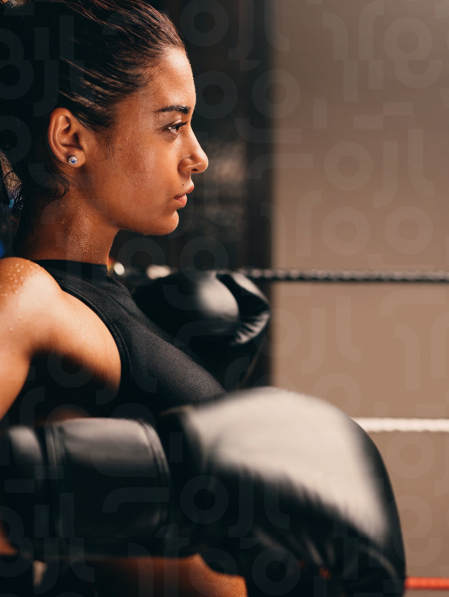 Sideview of a female boxer standing against the ropes in a boxing ring
