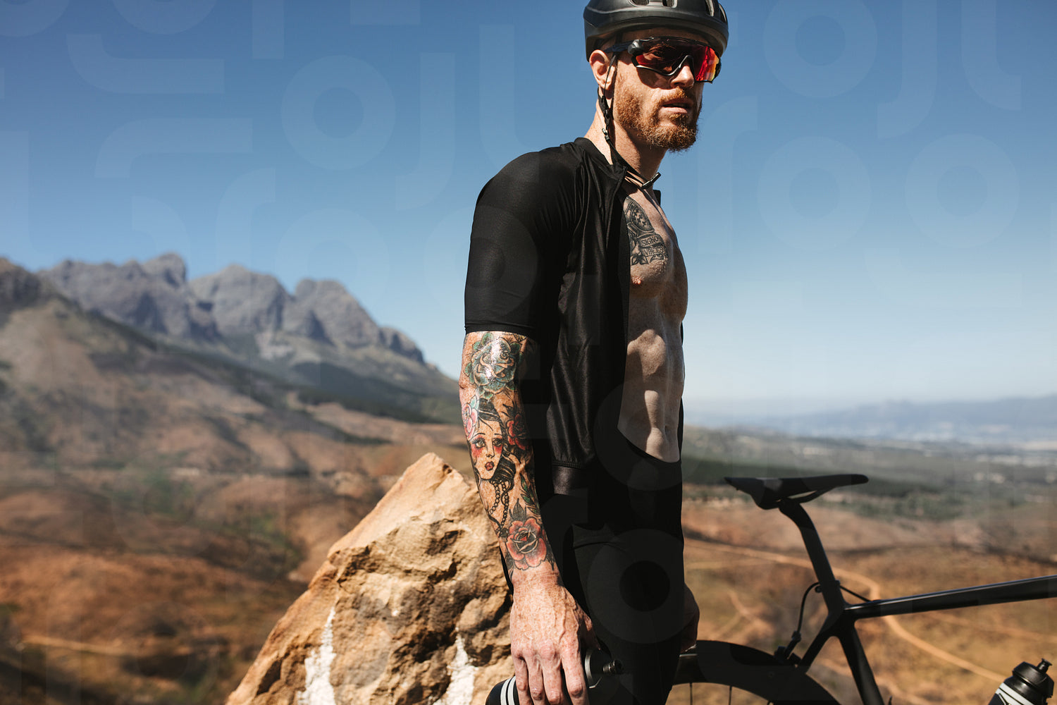 Portrait of exhausted male cyclist taking break during intense cycling training. Tired looking sportsman standing with his shirt open.