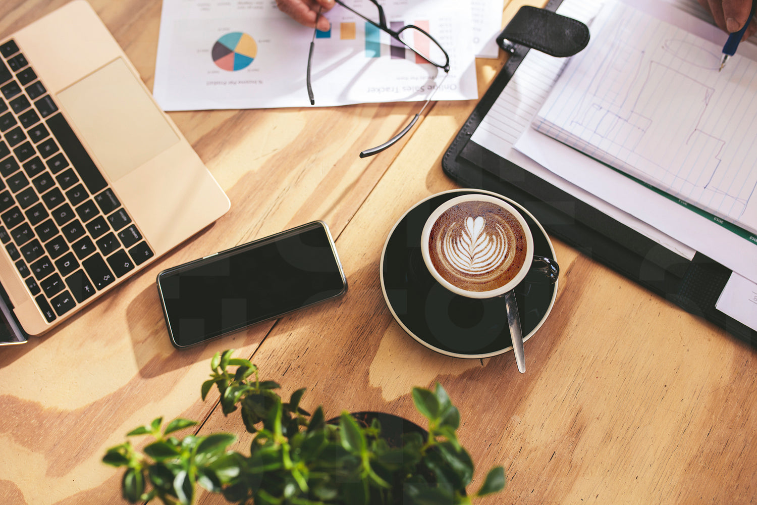 Top view of cup of hot cappuccino art coffee on wooden table with businesspeople working on some documents. Cup of coffee with milk foam art pattern on cafe table with laptop, mobile phone and some paperwork on side.