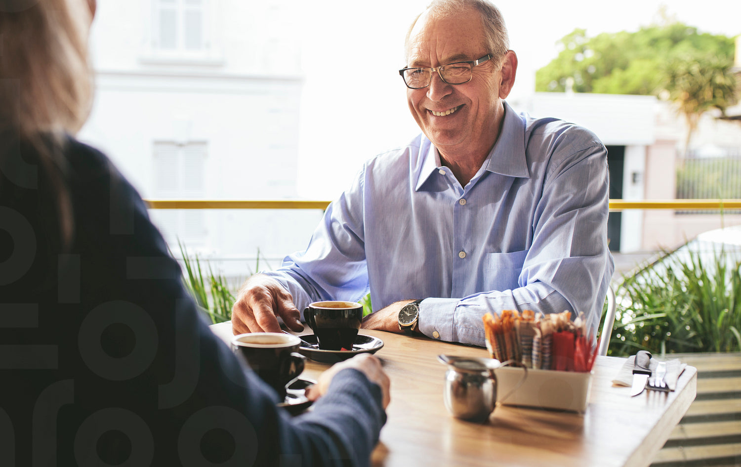 Smiling senior man having coffee with a woman at coffee shop. Couple sitting at a cafe table and talking.