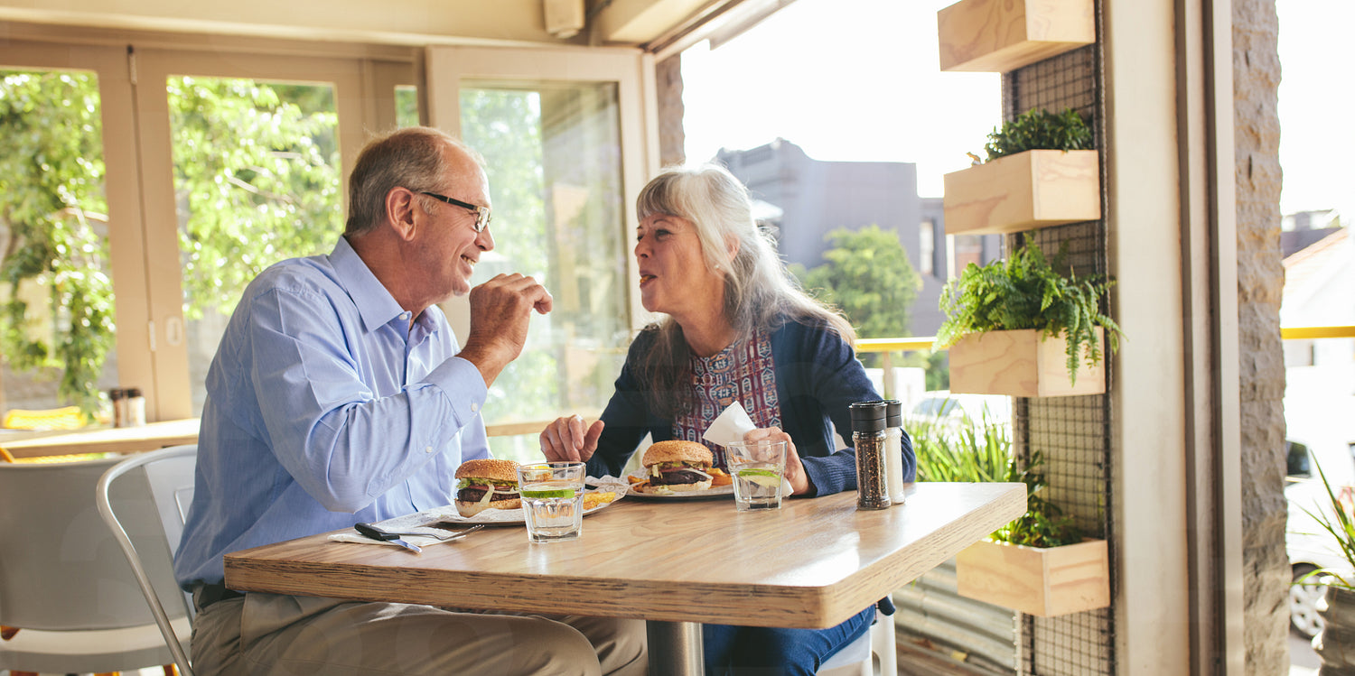 Senior couple enjoying eating burger together at a cafe. Smiling mature man and woman eating burger at a restaurant.
