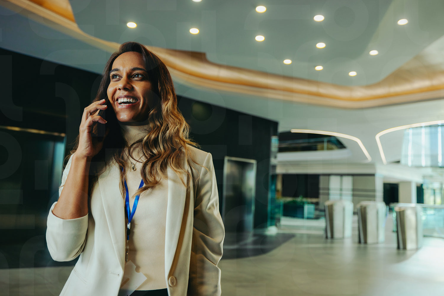 A confident Indian lawyer stands in a modern corporate lobby, engaging in a phone call with a smile. She exudes professionalism and a positive demeanor, creating an impression of business success.