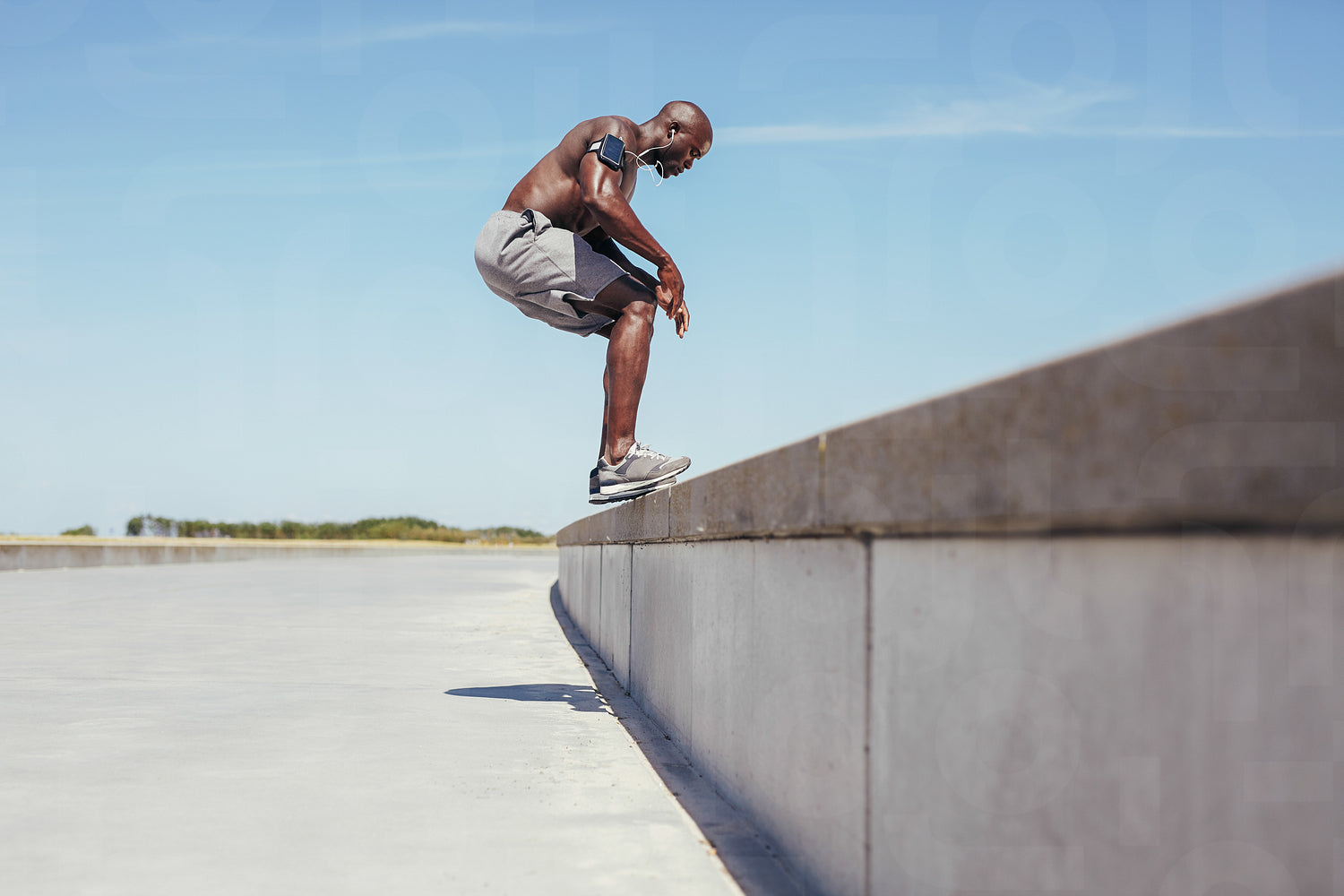 Image of shirtless young athlete jumping from a wall. African fitness male model doing jump exercise outdoors.