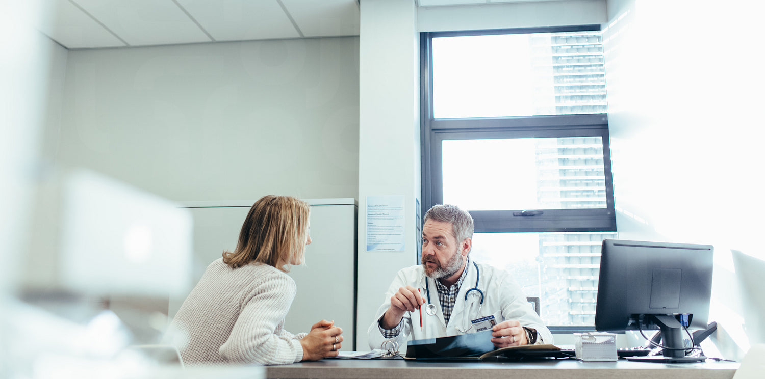 Male physician talking to a patient during consultation at his office. Mature doctor explaining diagnosis to female patient.