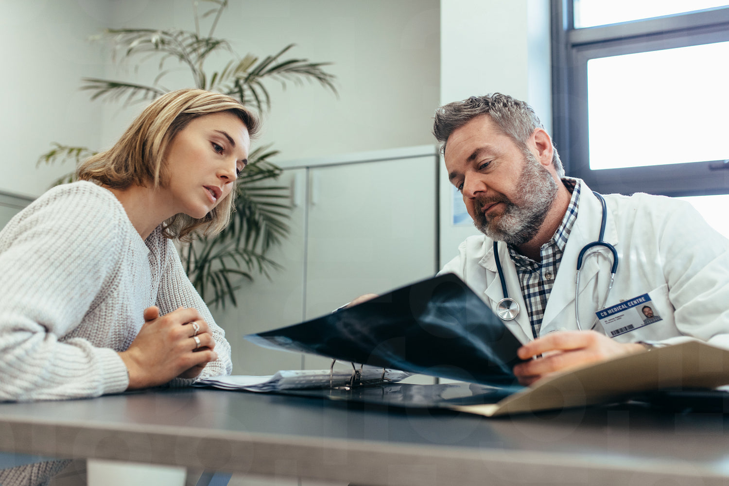 Doctor showing diagnosis of x-ray image to female sitting at office desk. Doctor holding medical scan results and discussion with woman patient.