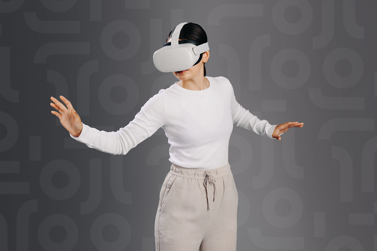 Digital woman exploring virtual reality with vr goggles in a studio. Young woman interacting with a vr game while standing against a grey background. Woman gaming in the metaverse.