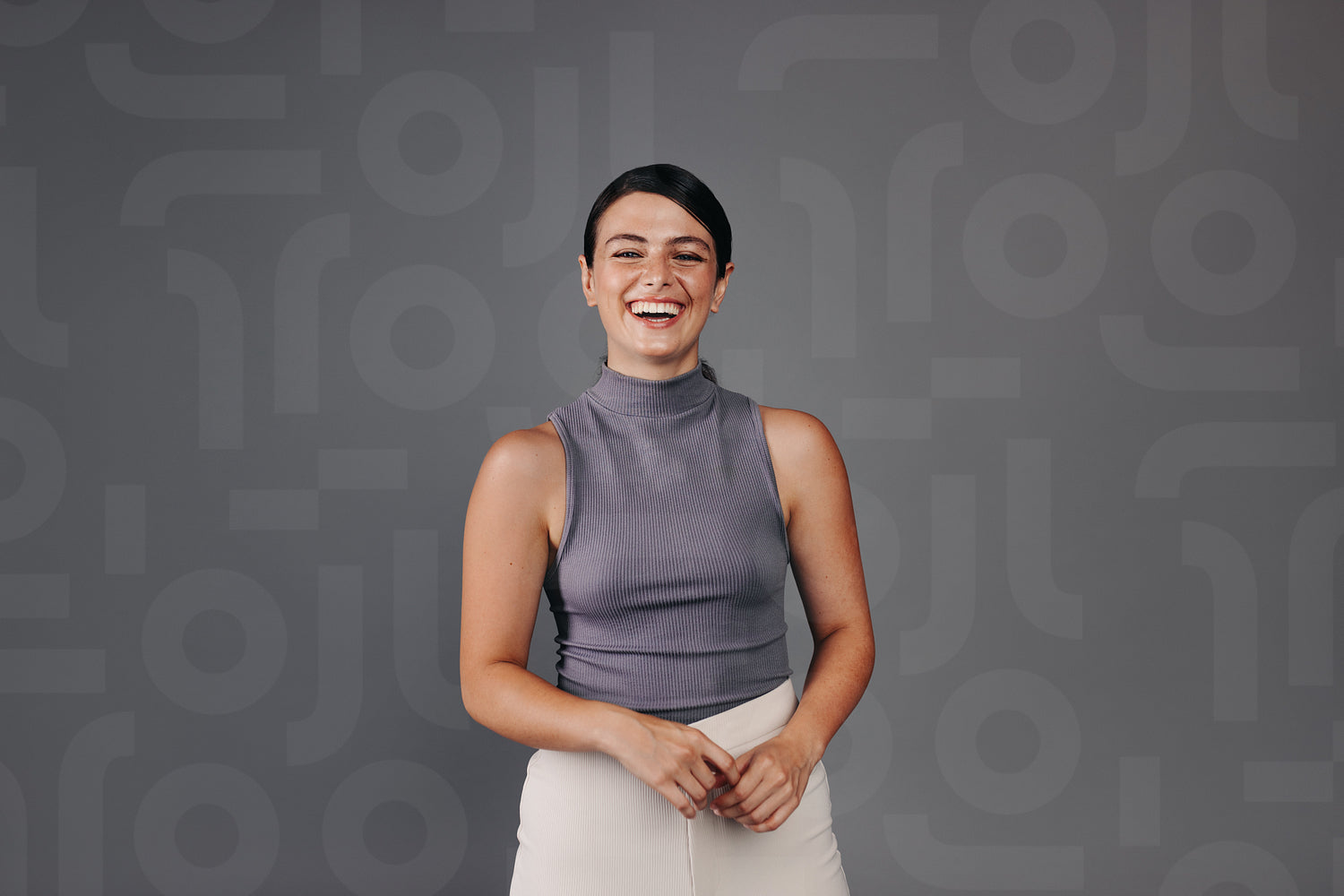 Portrait of a happy young woman laughing and looking at the camera in a studio