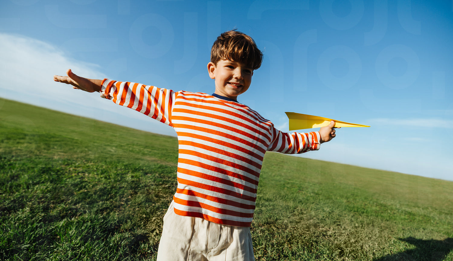 A boy in a striped shirt stands in a vast green field, arms outstretched, launching a yellow paper plane on a sunny day, capturing carefree outdoor play and joy.
