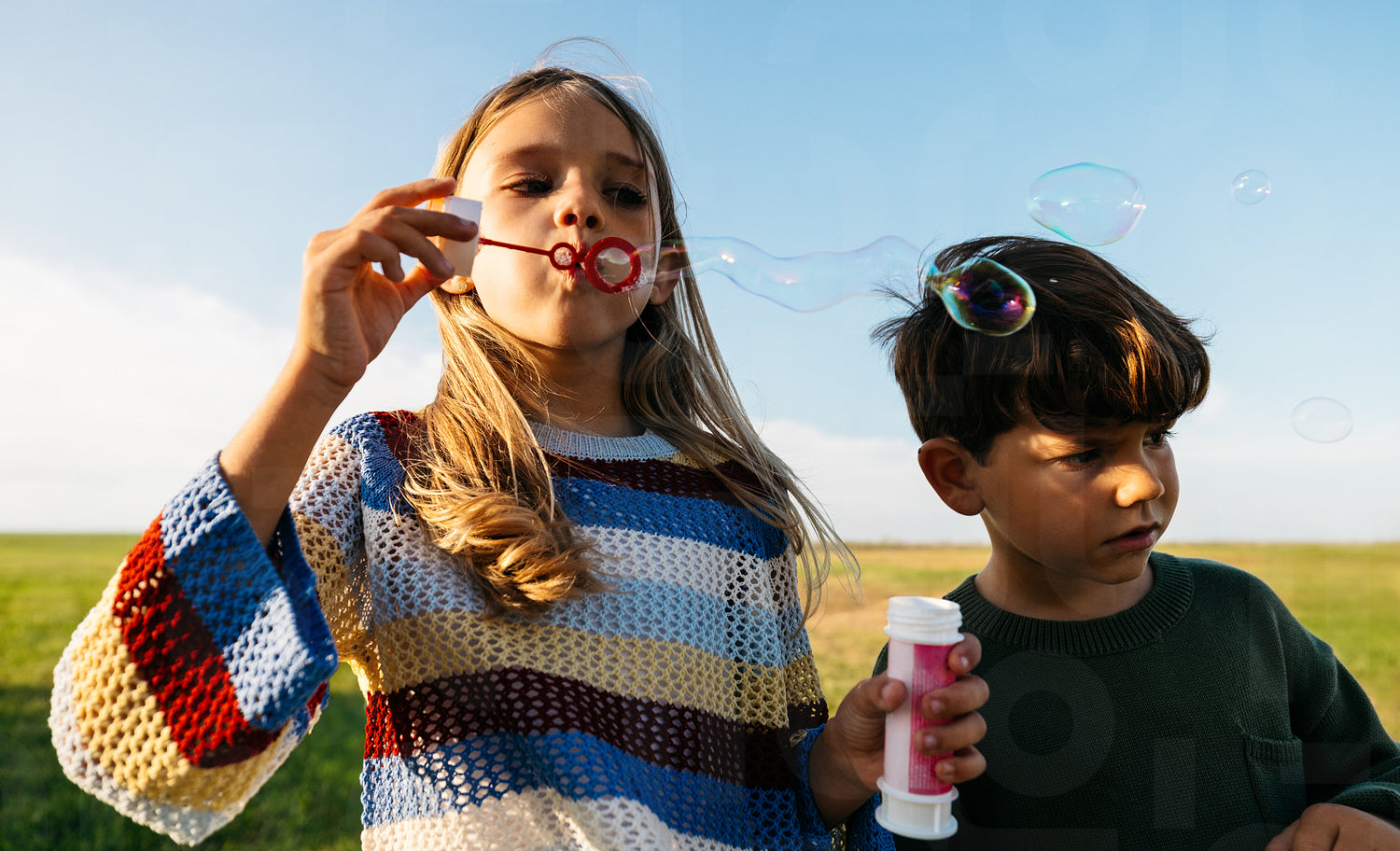 White girl and White boy enjoy bubble play outdoors in a sunny field.