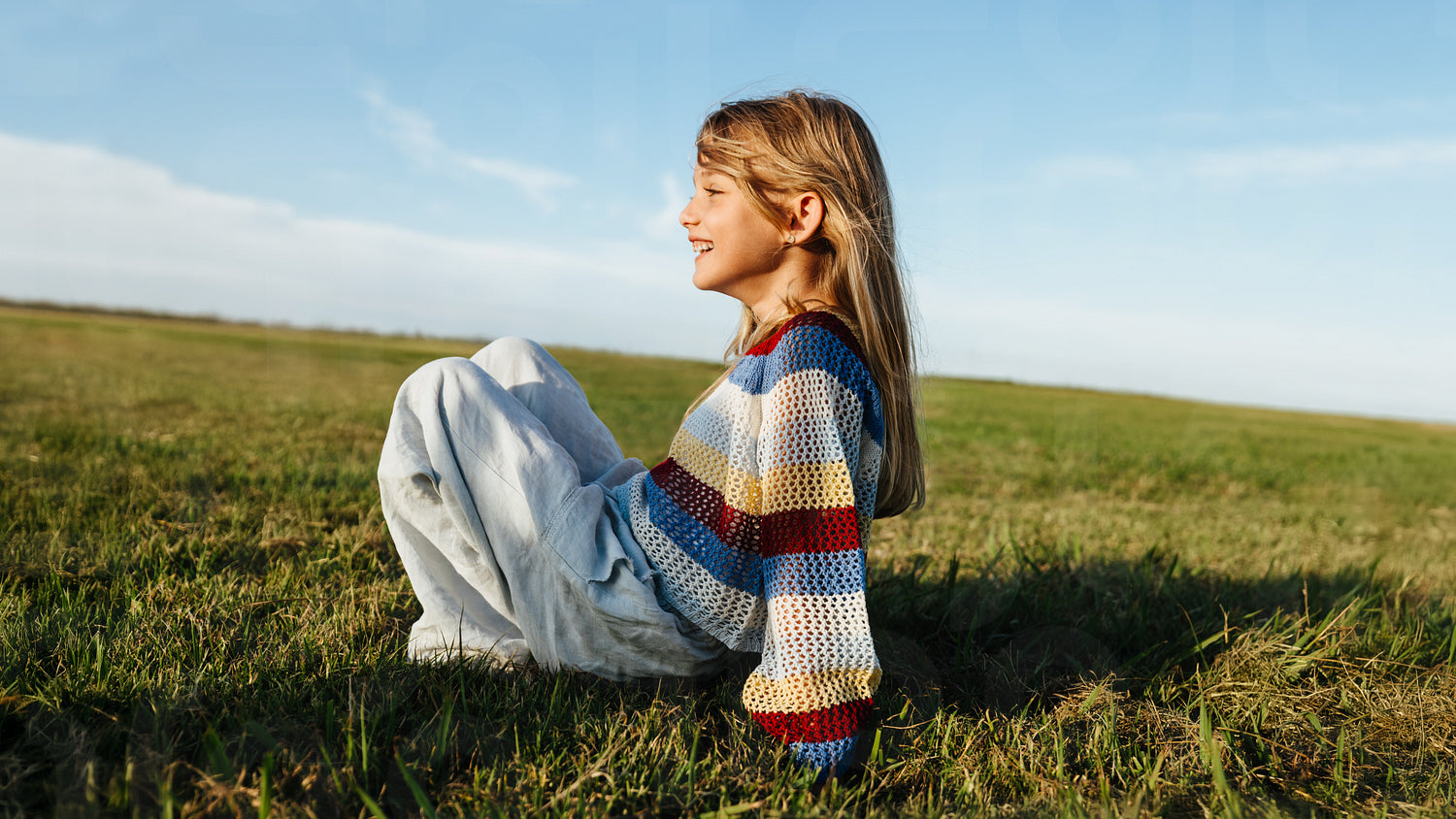 A girl sits in a wide grassy field under a blue sky, enjoying a peaceful, carefree moment outdoors.