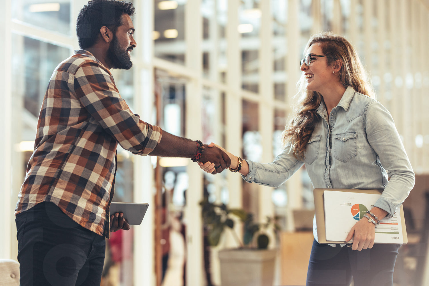 Business partners shaking hands after a discussion. Woman entrepreneur holding official papers greeting a business client at work place.