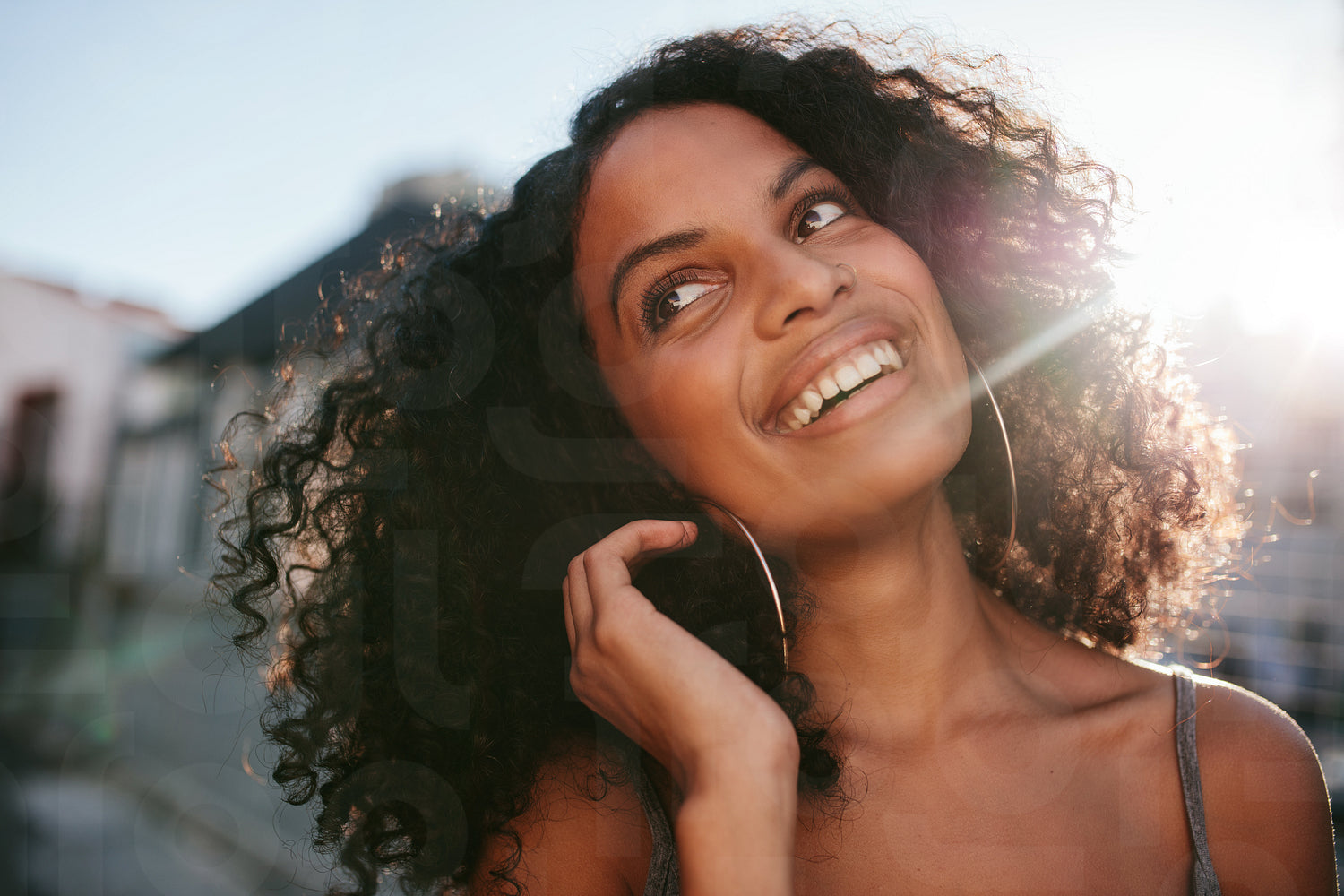 Close up portrait of young african woman with curly hair looking away. Afro american female standing outdoors and smiling.
