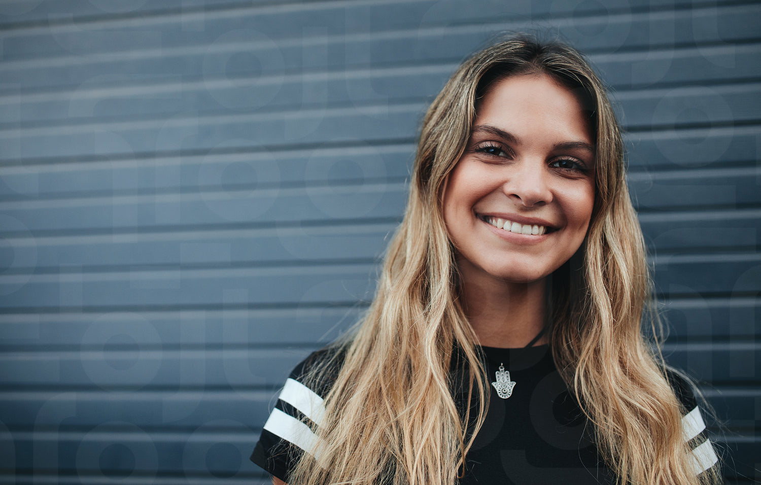 Close up portrait of smiling young female standing against gray wall. Beautiful caucasian young woman looking at camera and smiling.