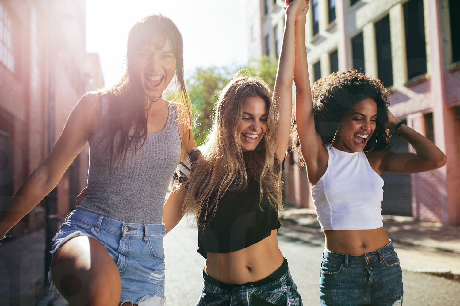 Three young women walking together having fun. Multi ethnic female friends walking outdoors in city.