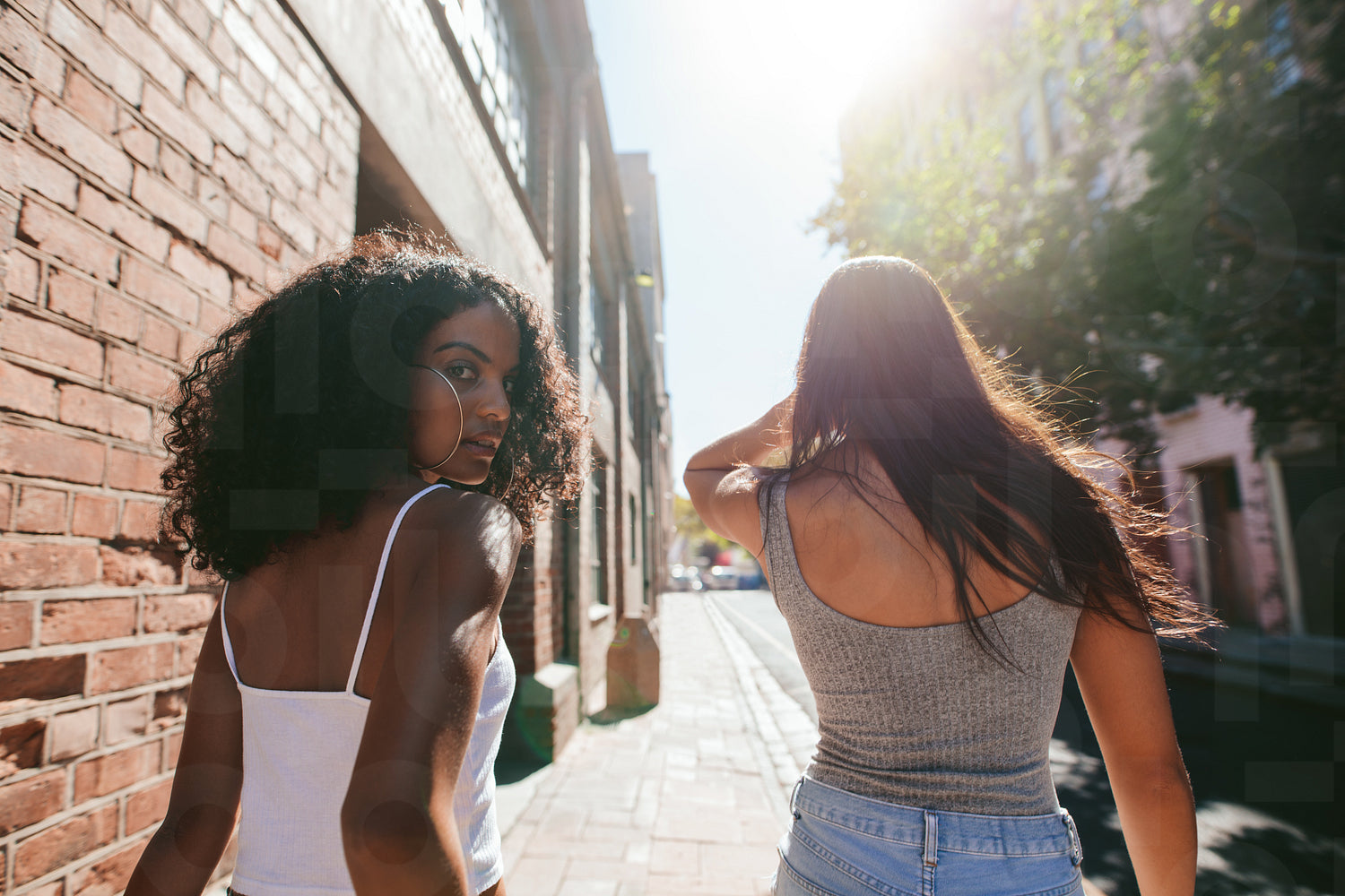 Rear view shot of young african woman looking over her shoulder while walking with her friend on city street. Two young women walking together outdoors.