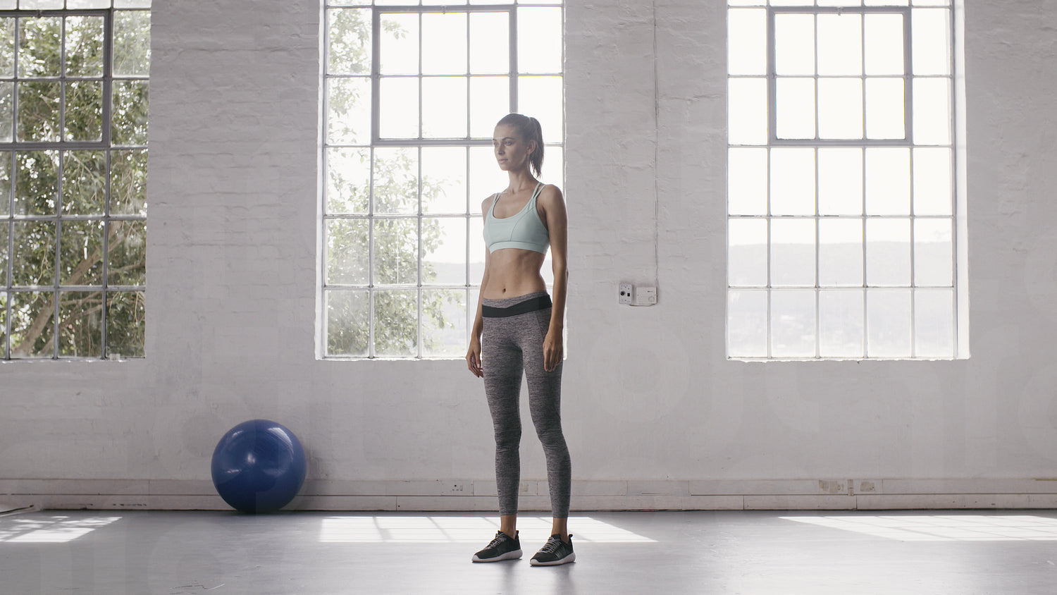 Sporty woman practicing perfect squats exercises with hands outstretched in front at gym. Woman in sportswear exercising at fitness studio.