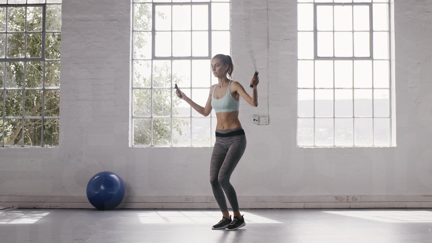 Healthy woman jumping ropes at gym. Female in sportswear exercising with skipping ropes at fitness studio.