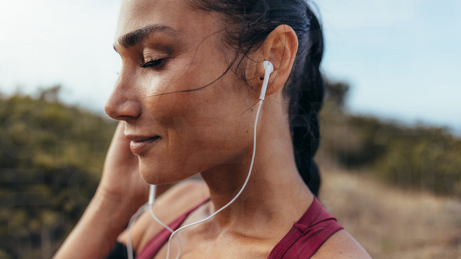 Pretty young woman wearing earphones to listen music before starting her running workout. Fit female athlete before her run outdoors.