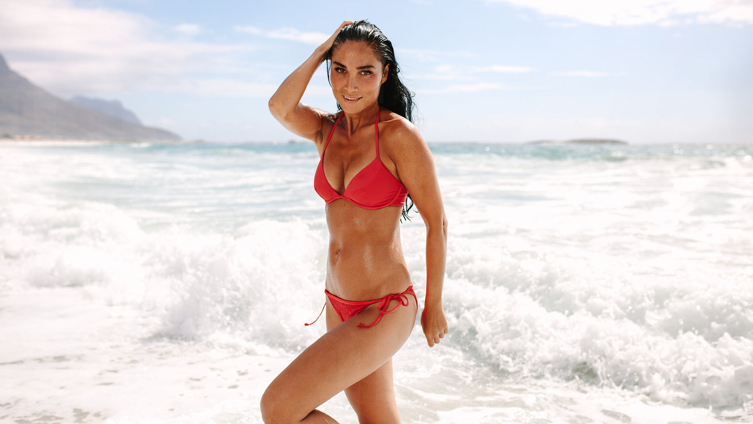 Beautiful woman posing in swimsuit on beach