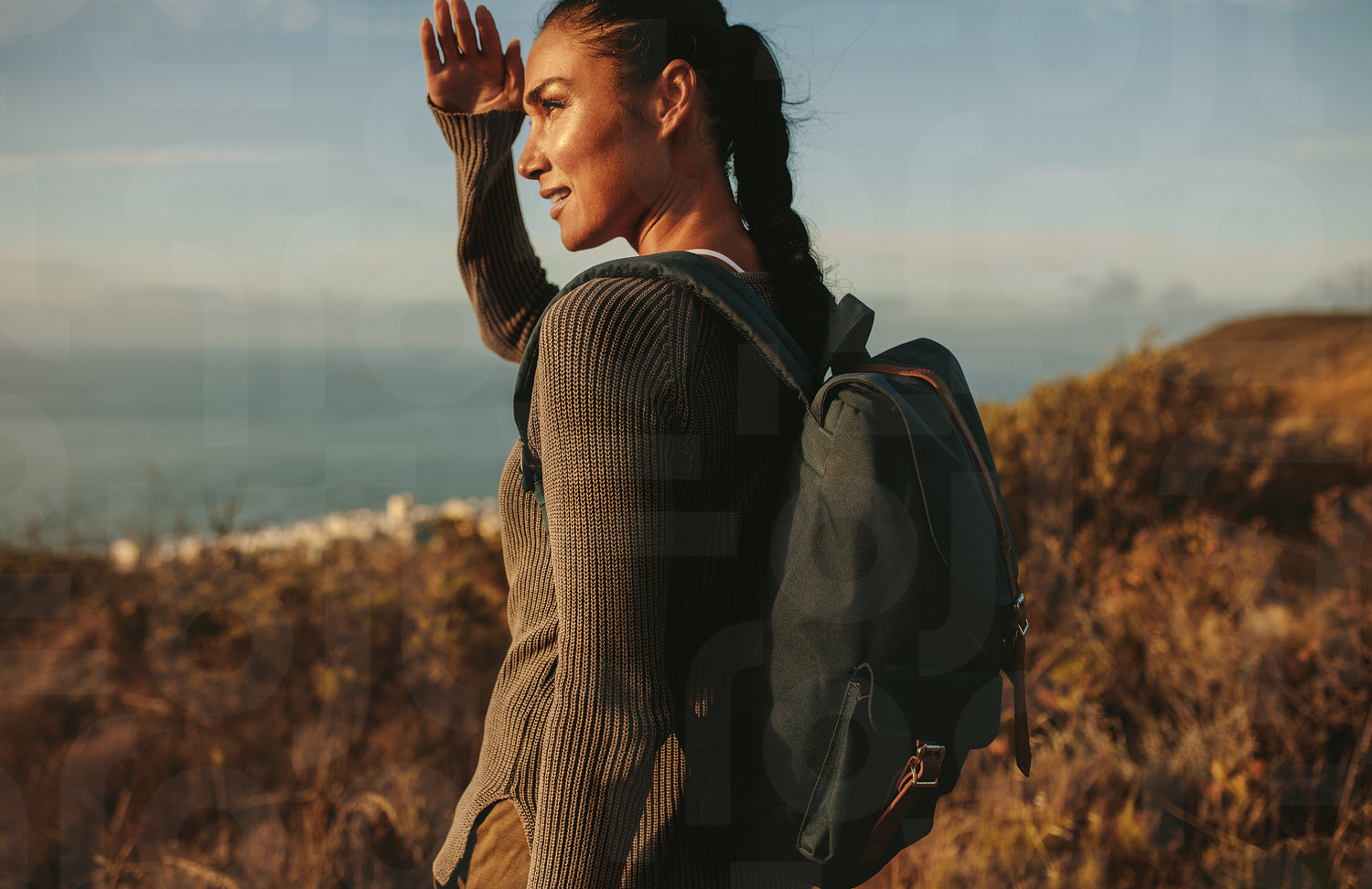 Woman hiker looking at a distance with hand over eyes. Female with backpack on country walk looking away at a view.