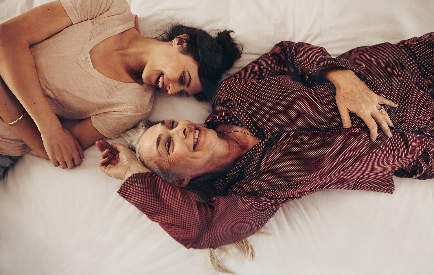 Two women lying on bed head to head with legs in opposite directions. Mother and daughter on bed talking while sleeping in opposite direction facing each other.