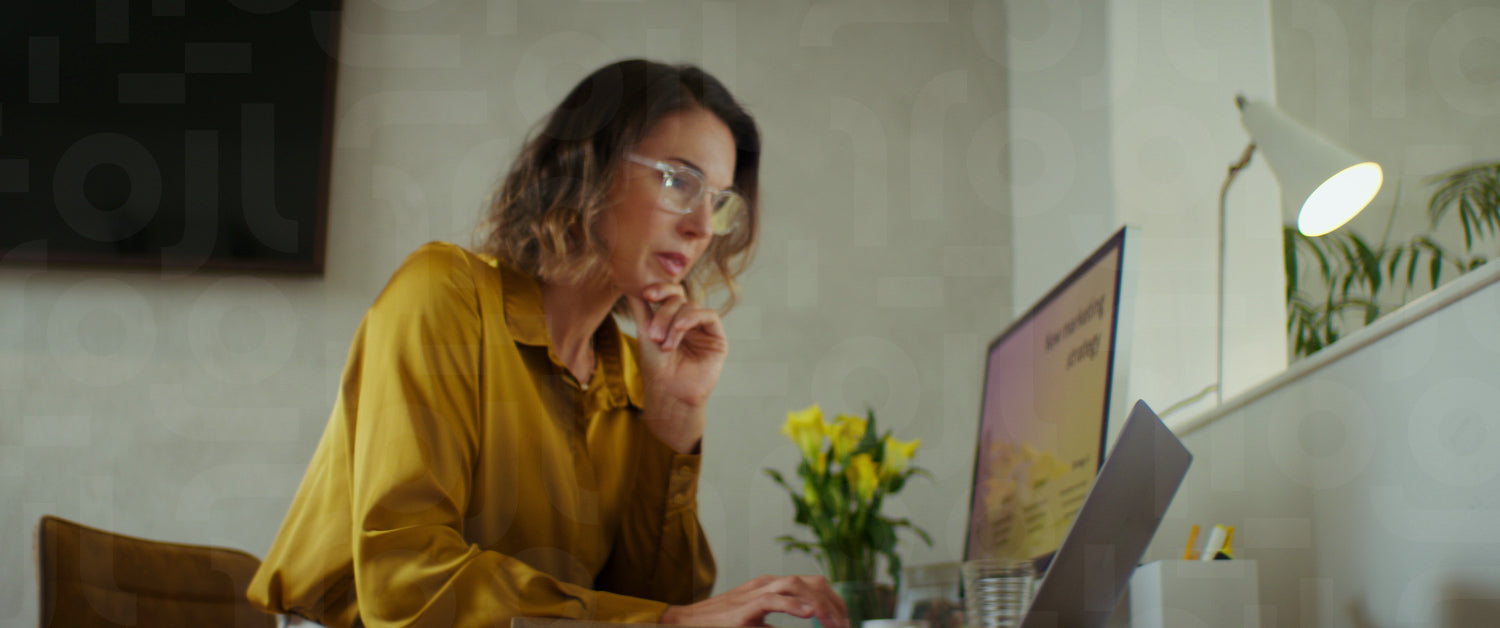 Thoughtful businesswoman works on her laptop in a medium shot. She's in her home office with a monitor and flowers on her desk. Shot with anamorphic lens in cinemascope format.