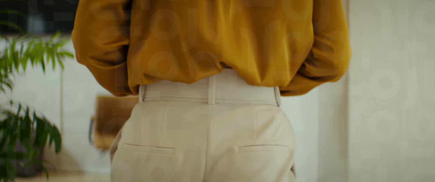 A woman walks into her office, sits down at her desk, and begins working on her laptop. Medium shot. Shot with anamorphic lens in cinemascope format.