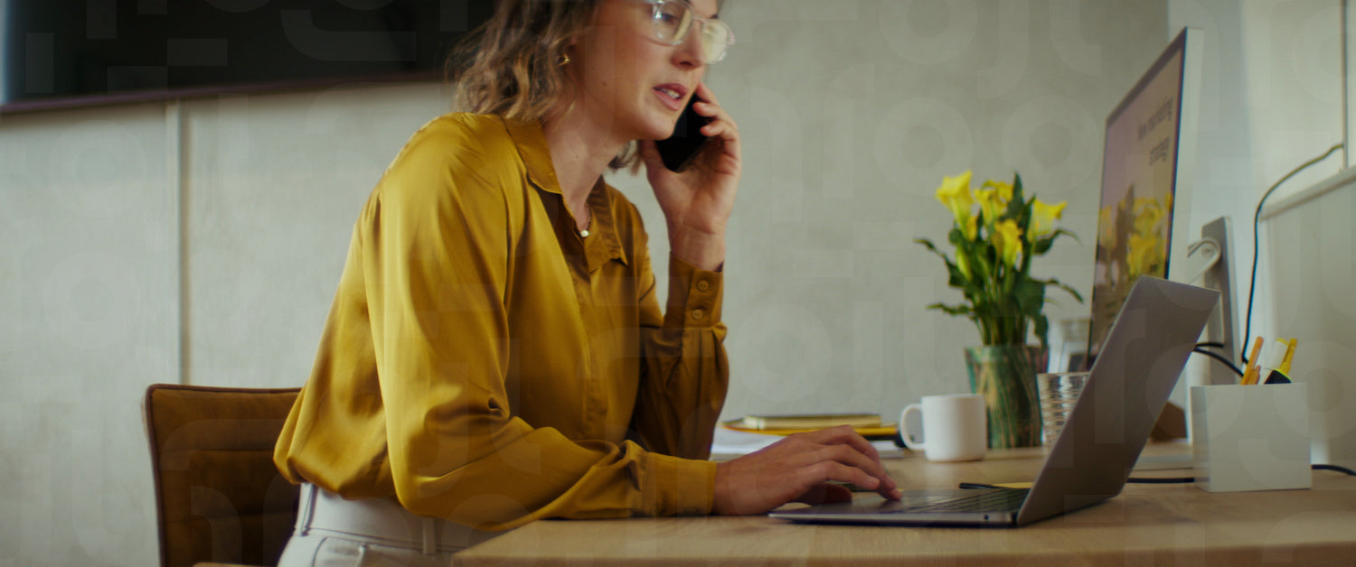 A business executive works from her modern, bright home office, talking on her cell phone while using her laptop and walking. Shot with anamorphic lens in cinemascope format.