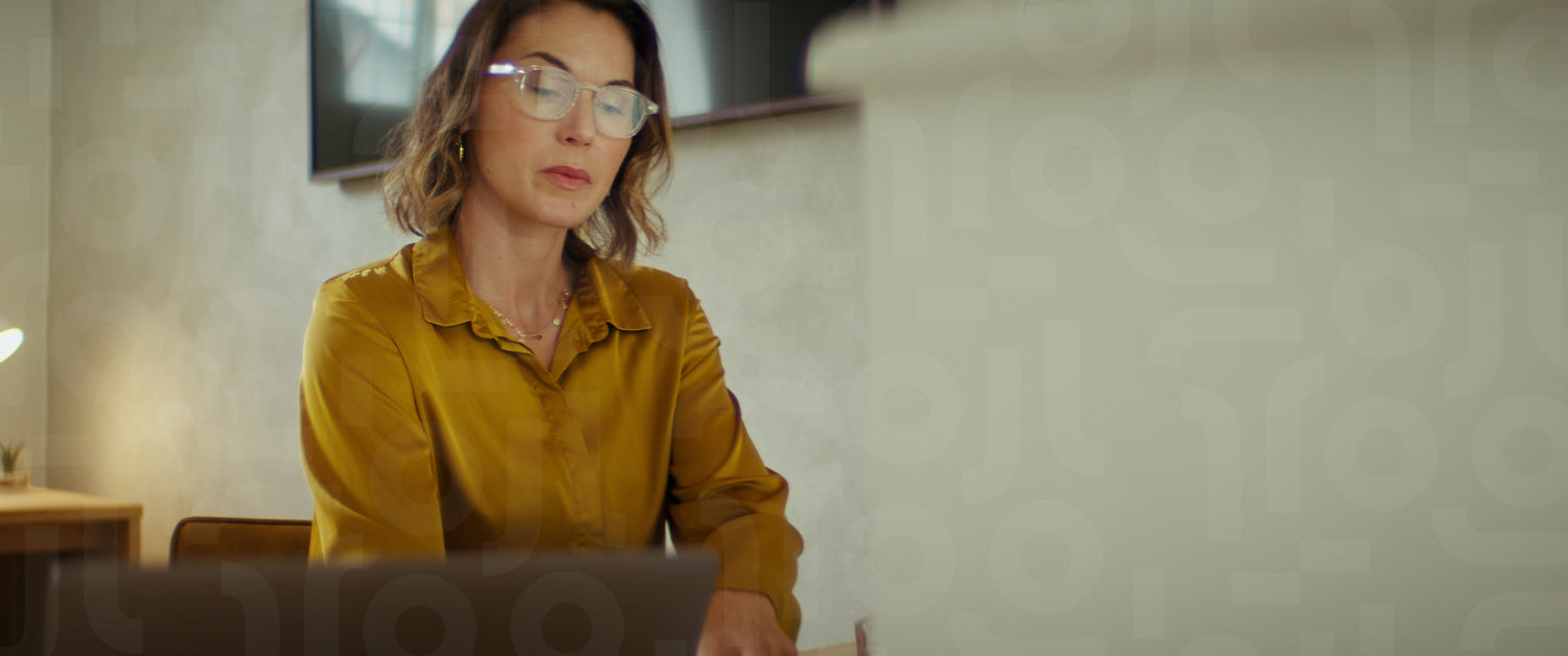 Businesswoman working in the office. Wide shot of an executive reviewing documents at her desk. Shot with anamorphic lens in cinemascope format.
