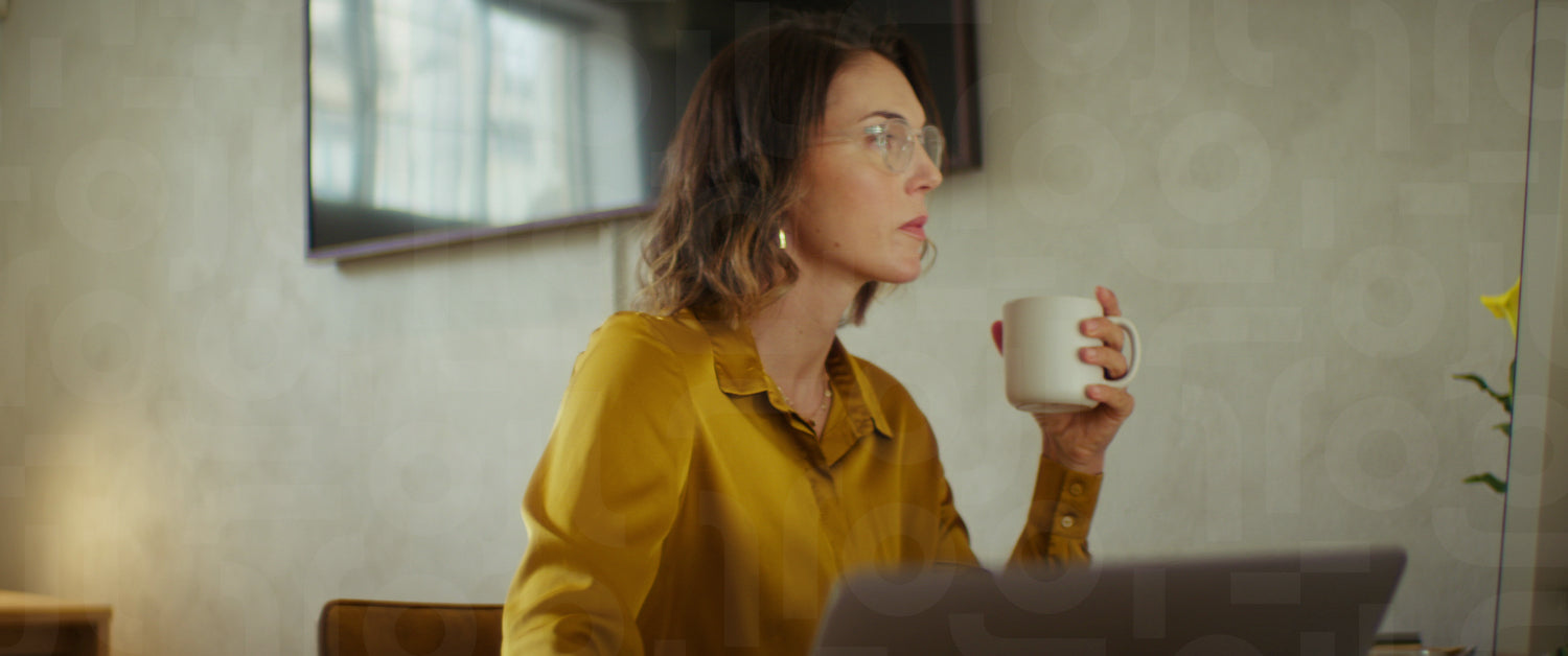 Successful businesswoman works from home office. Medium shot of woman drinking coffee and thinking while working on laptop. Shot with anamorphic lens in cinemascope format.