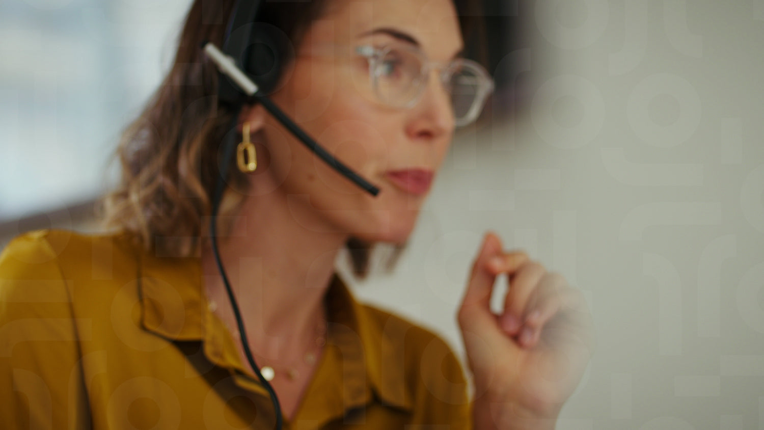 Close-up of businesswoman talking on a headset with a microphone, focused on work in her contemporary office.