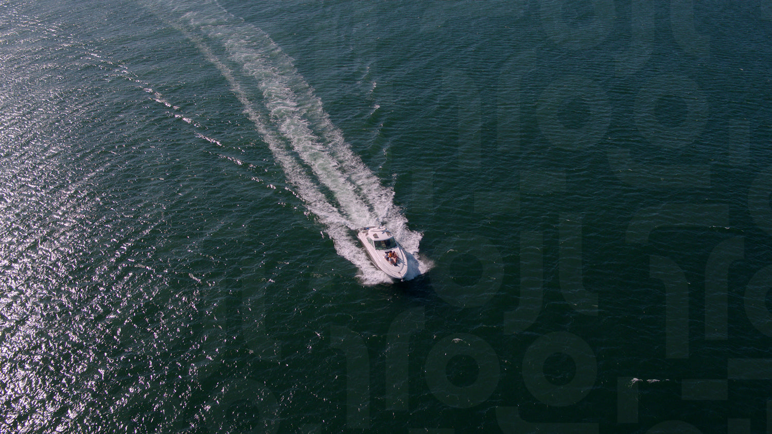 Drone shot of group of friends sitting on the deck of a yacht sailing in the sea. Group of people relaxing on a yacht deck on a summer day.