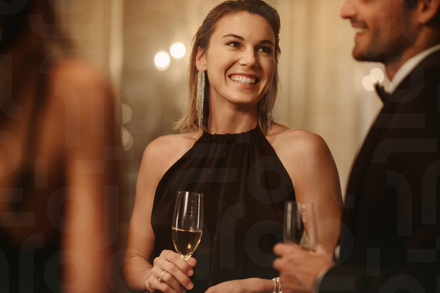 Beautiful woman talking with friends at a party. Group of young people with champagne at a gala night.