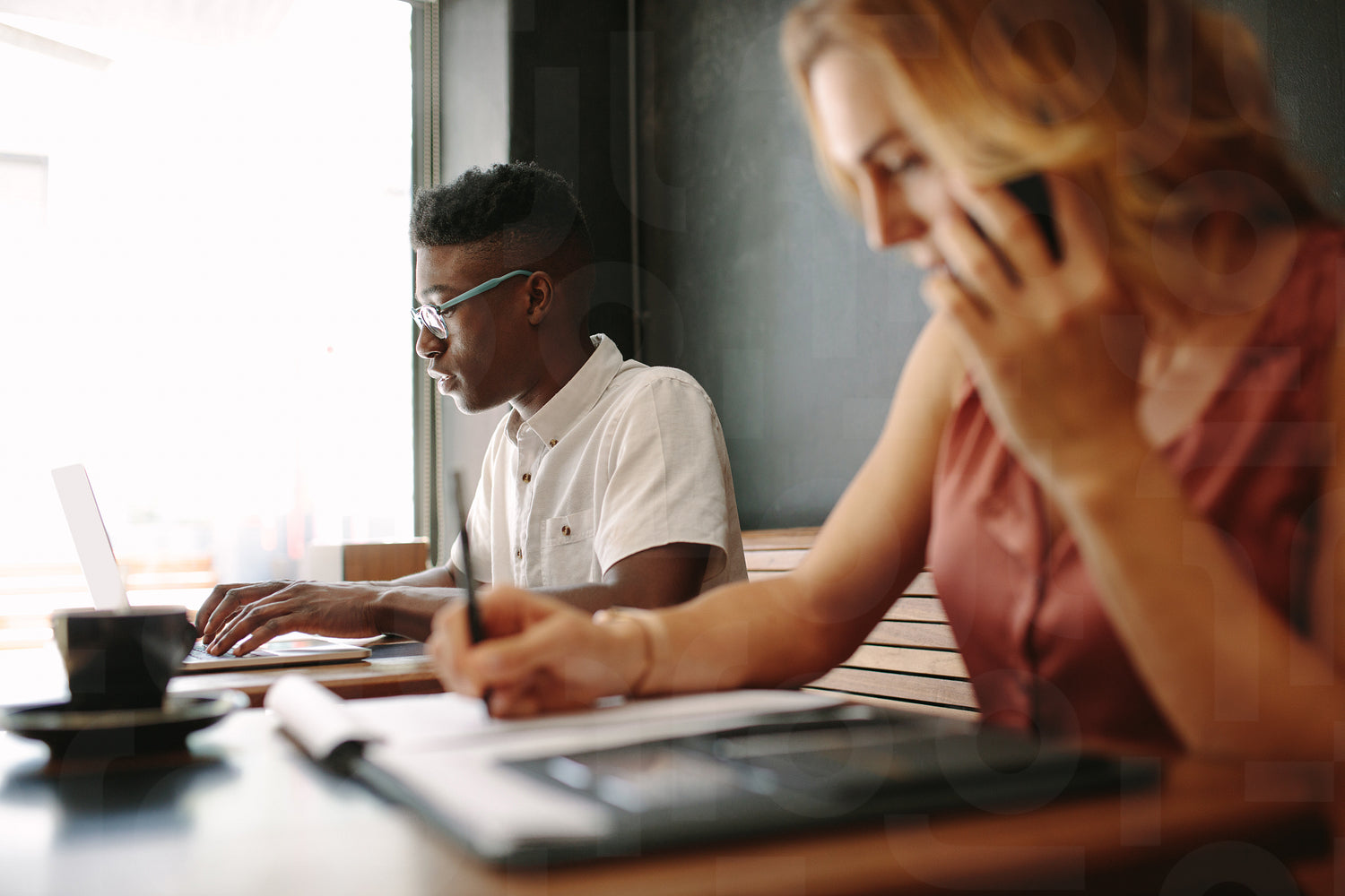 Woman entrepreneur writing in notepad while talking over mobile phone. Man working on laptop sitting at a coffee shop.