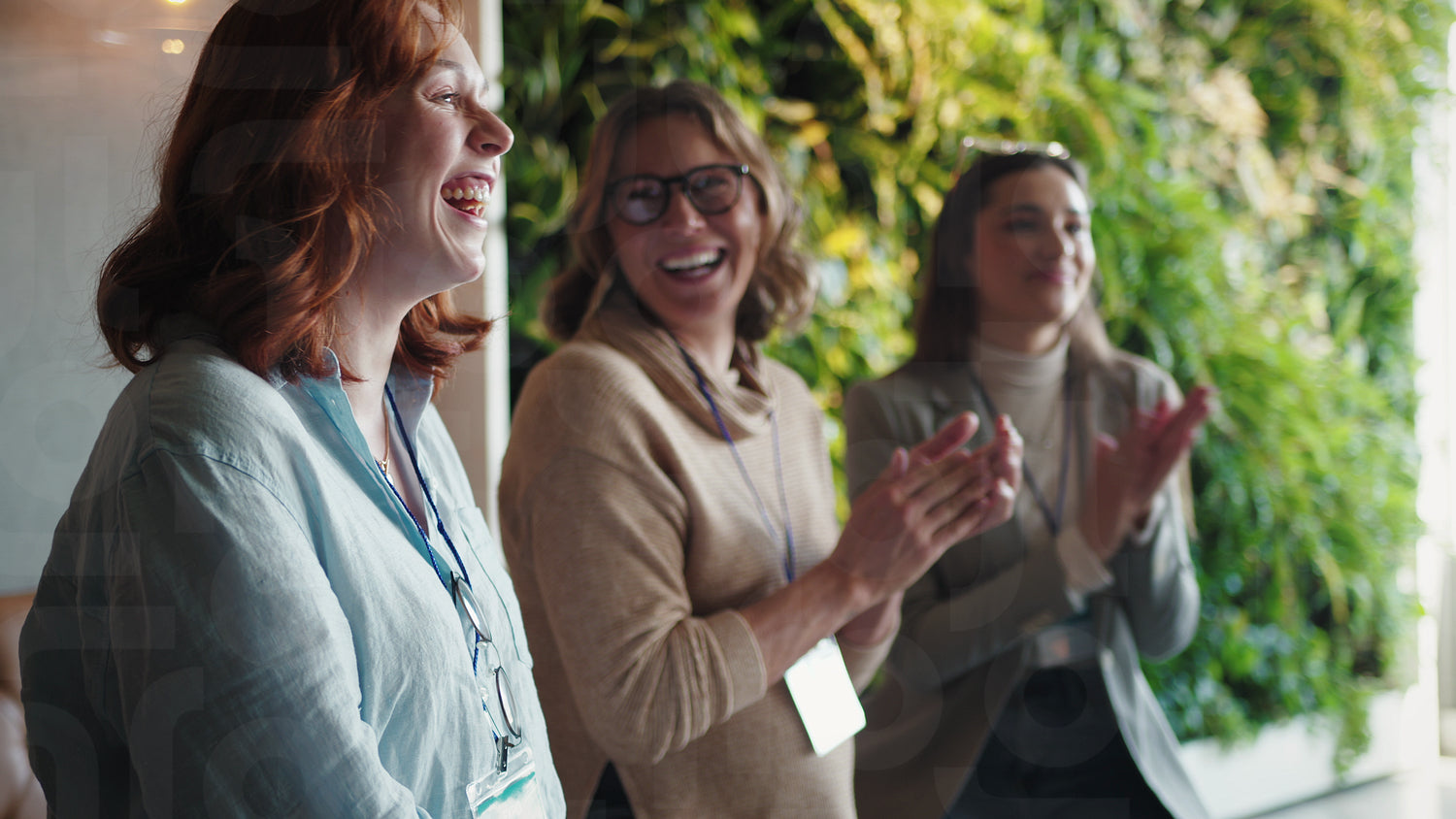 Business women receiving an applause from her colleagues during a business conference. Female professionals celebrating success. Women having a panel meeting in an office.