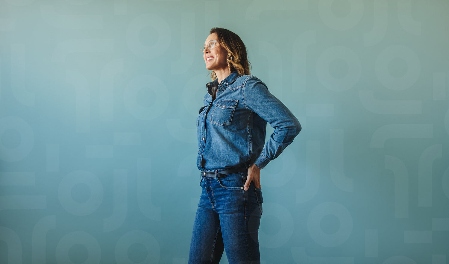 Businesswoman, dressed in business casual attire and a denim outfit, smiles with confidence while standing in a professional studio setting, representing her success and achievements in the business world.