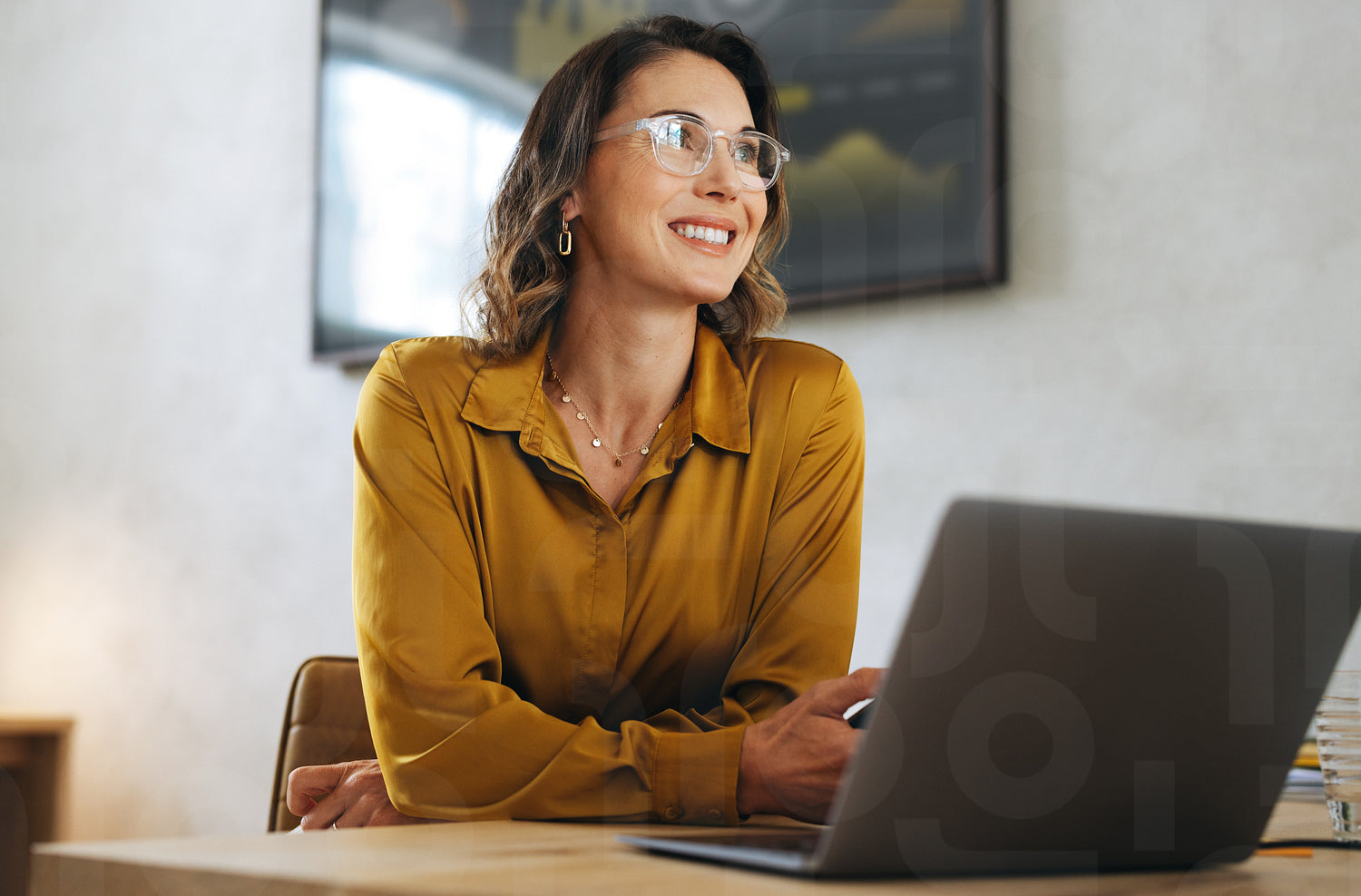 Successful businesswoman looks away with a thoughtful expression while wearing eyeglasses. With a warm smile, she reflects on her career achievements and ongoing success as an entrepreneur.