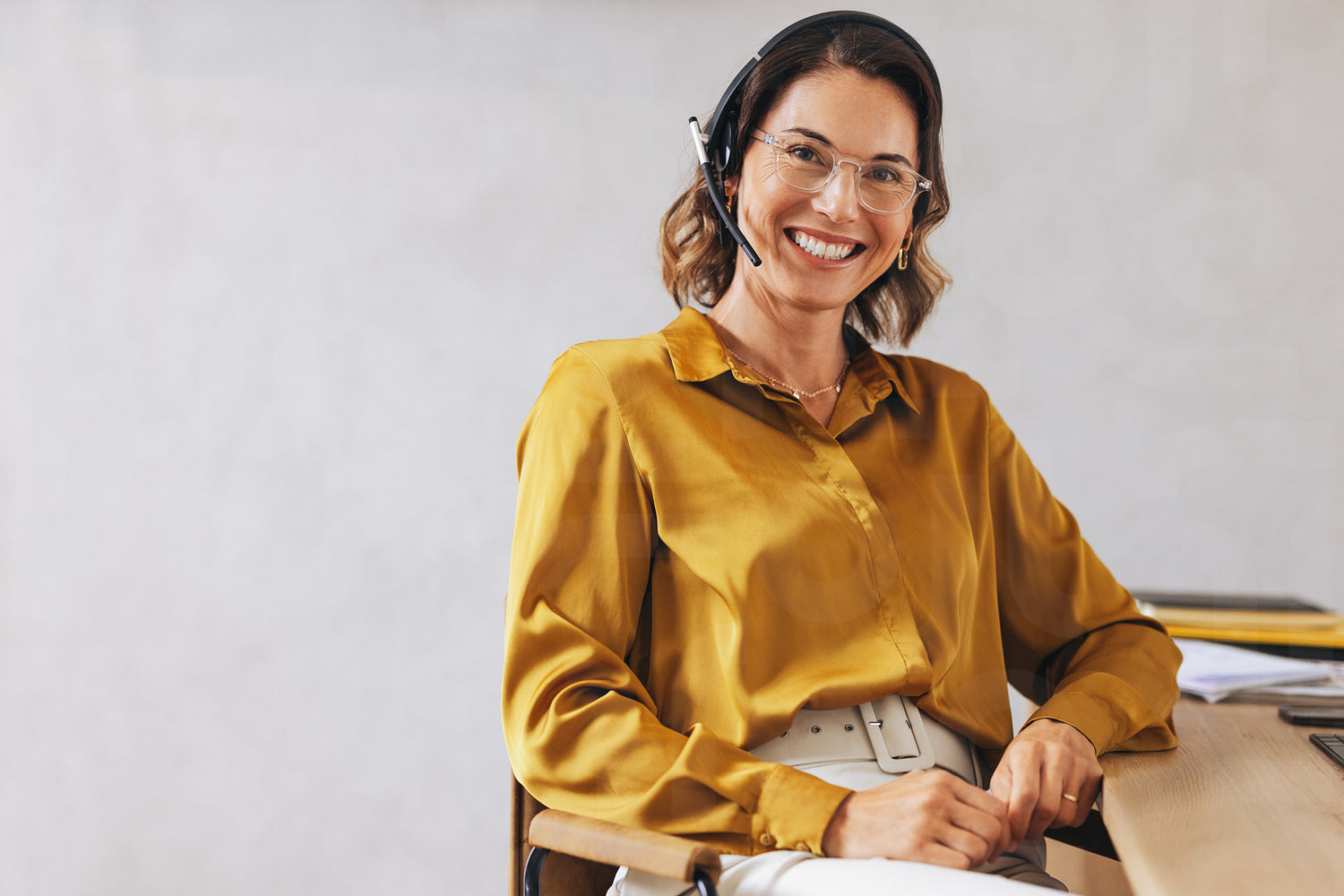 Call center agent wearing eyeglasses and a headset sits in an office. Woman using her expertise in telecommunications and customer service to efficiently assist customers and provide remote support.