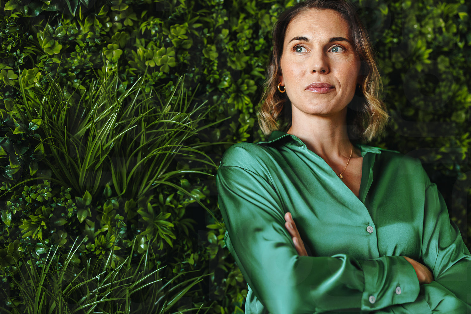 Accomplished executive woman stands in a green office, proud of her role as CEO of a responsible business. Business woman leading her company to achieve its sustainable goals.