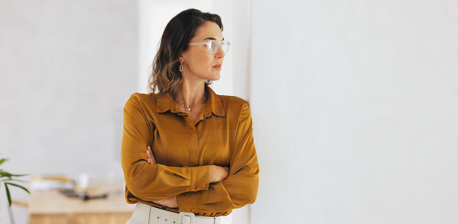 Confident female CEO stands confidently in her office, contemplating the future of her company with her arms crossed as a strong entrepreneur who is ready to lead her company to success.
