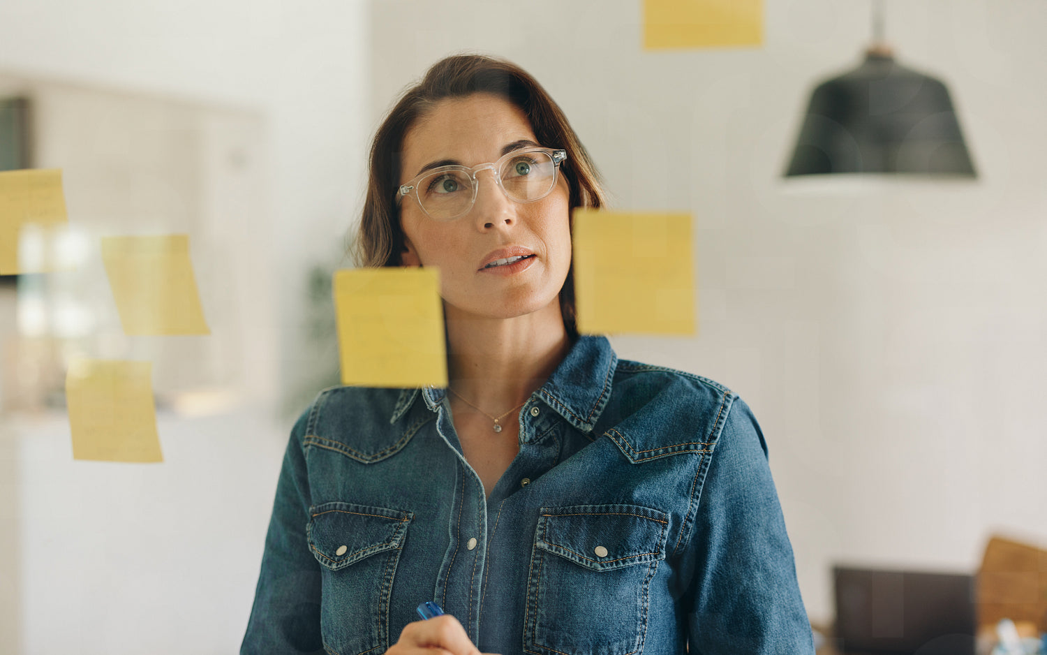 Businesswoman wearing a denim jacket stands near a glass wall covered in sticky notes. Woman working in a creative workplace, generating innovative ideas for her entrepreneurial ventures.
