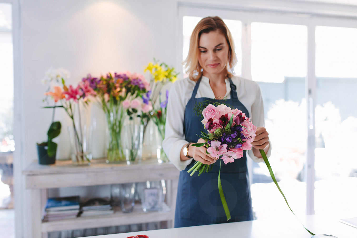 Female florist at work preparing a bouquet. Woman standing at counter making a bouquet of fresh flowers.