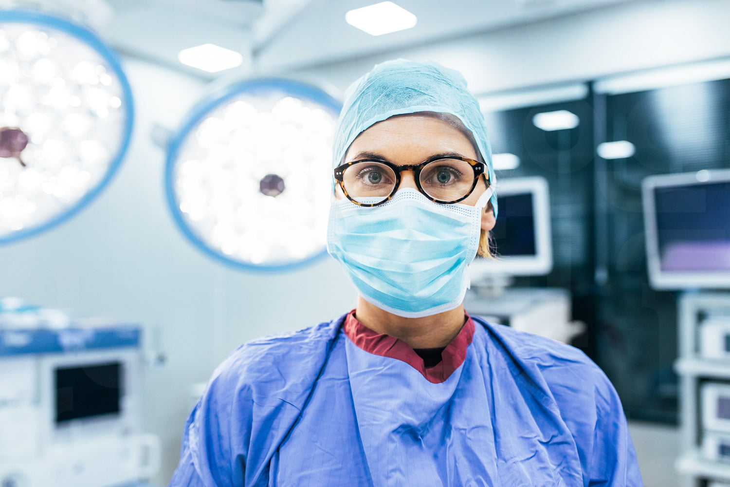 Close up portrait of female surgeon wearing surgical mask and scrubs in operation theater. Professional medical ready for operation in hospital.