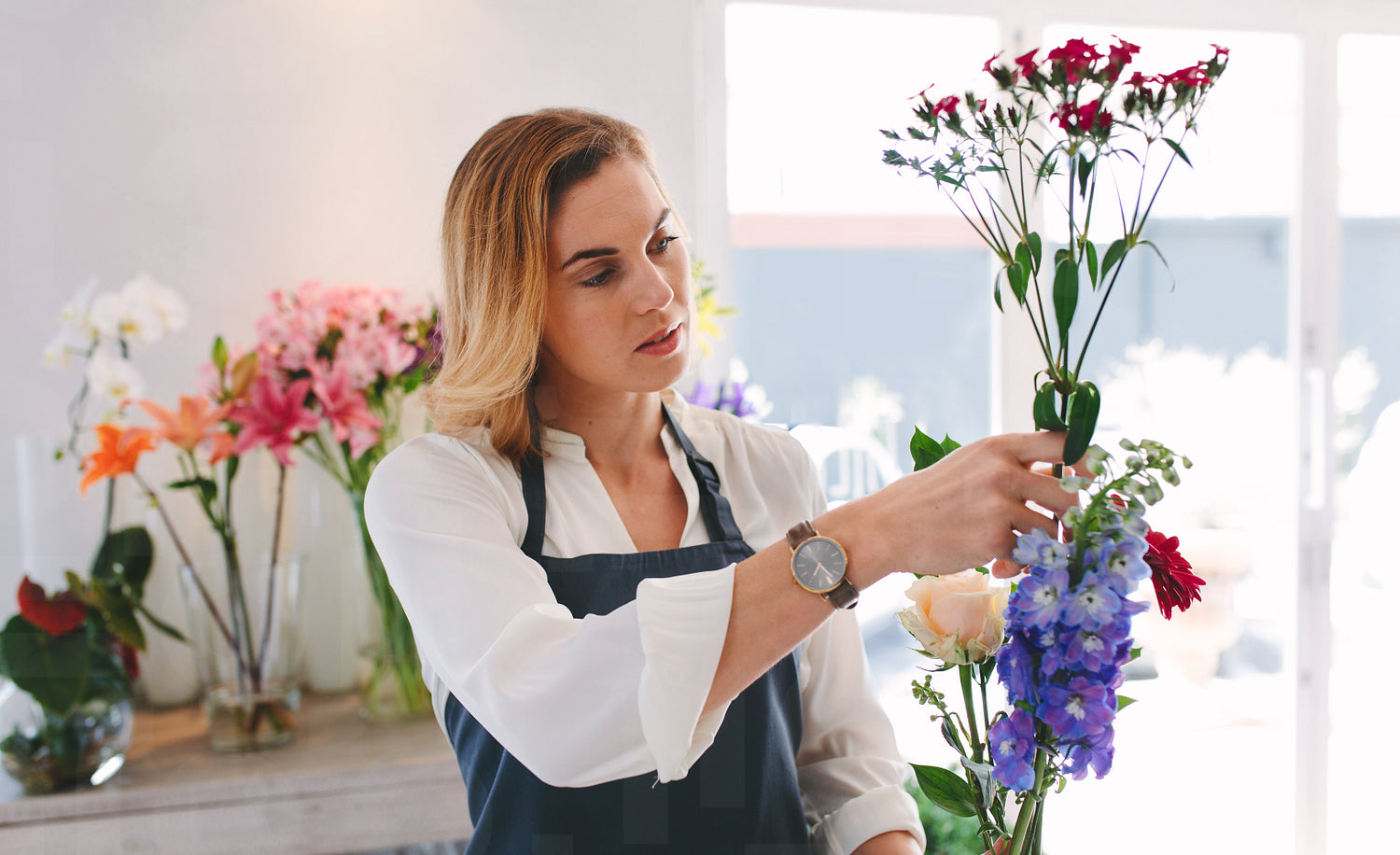 Female working at flower shop arranging flowers. Woman florist making bouquet with various flowers.
