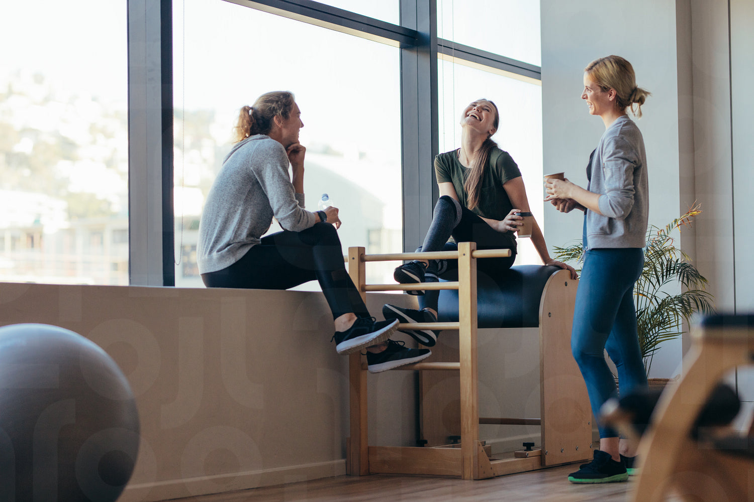Three fitness women at the gym talking to each other after workout holding coffee. Smiling gym girls sitting beside the window and talking after workout.