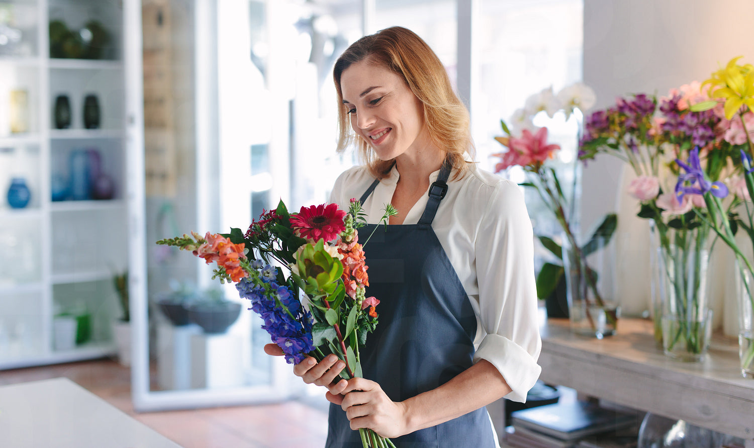 Happy female florist creating bouquet of flowers at her shop. Woman florist with a bouquet at workshop.